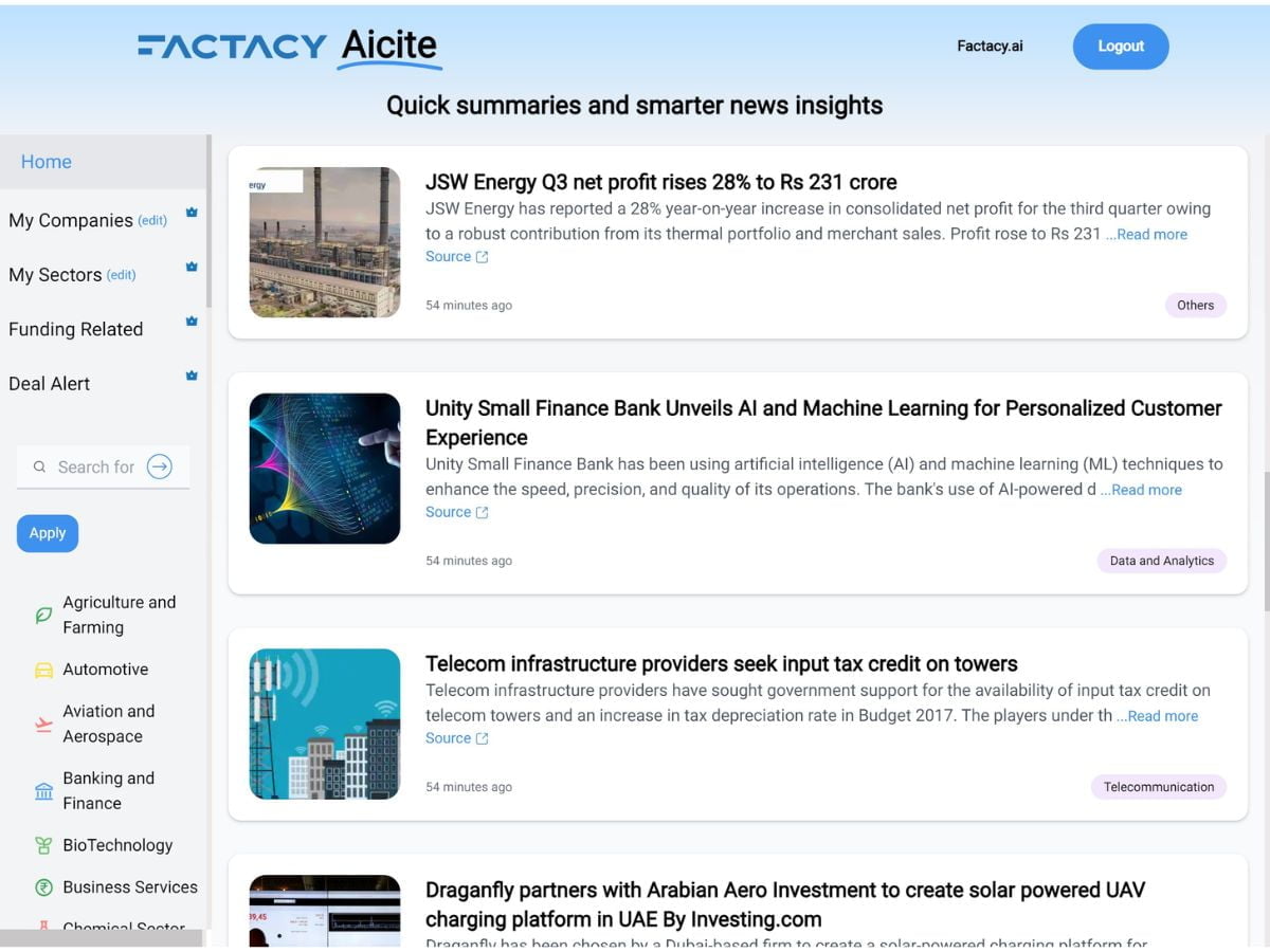 Factacy, an AI startup with 80+ years of combined expertise, is empowering Indian startups with tailored AI solutions, driving efficiency and growth. Fast emerging as a leading player in the development of AI-powered intelligence platforms, Factacy empowers organizations with valuable market intelligence derived from data, enabling data-driven decision-making and driving growth.
